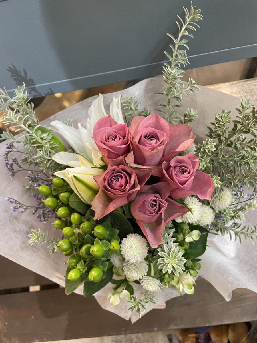 価格 5,500円(税込)グリーンベースのナチュラルなフラワーアレンジメントです。